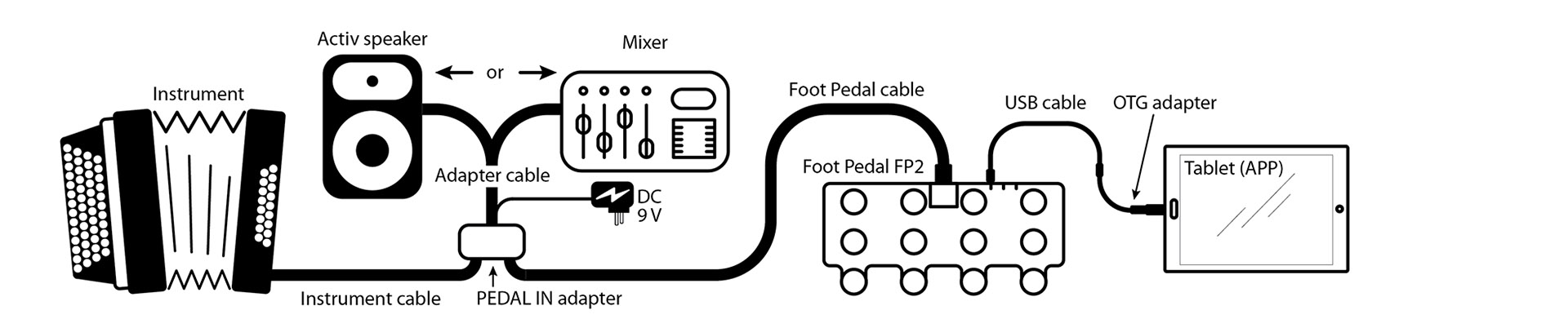 The "PEDAL IN Adapter" is connected between the control cable and the adapter cable (picture).