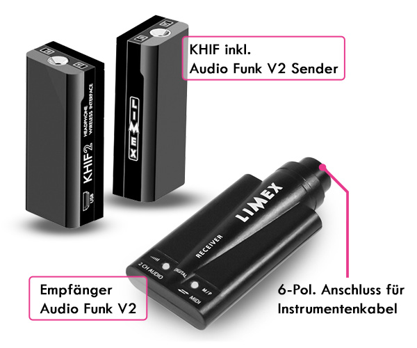 Das Audio Funk System V2 arbeitet im weltweit lizenzfreien 5,8 GHz Band, es kann somit ohne behördliche Anmeldung verwendet werden. Die Übertragung ist in Mono.